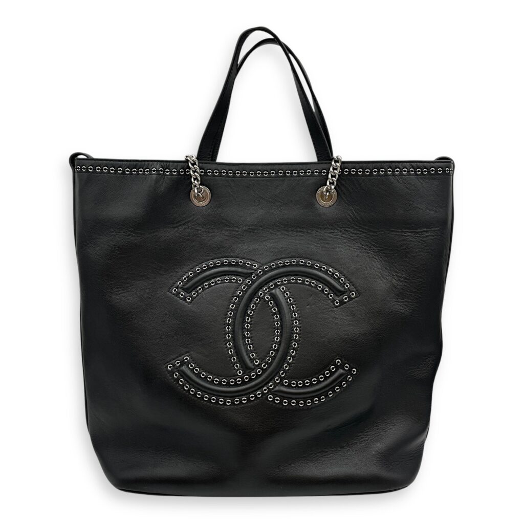 Eyelet Large Black Shoulder Bag in Calfskin, Silver hardware