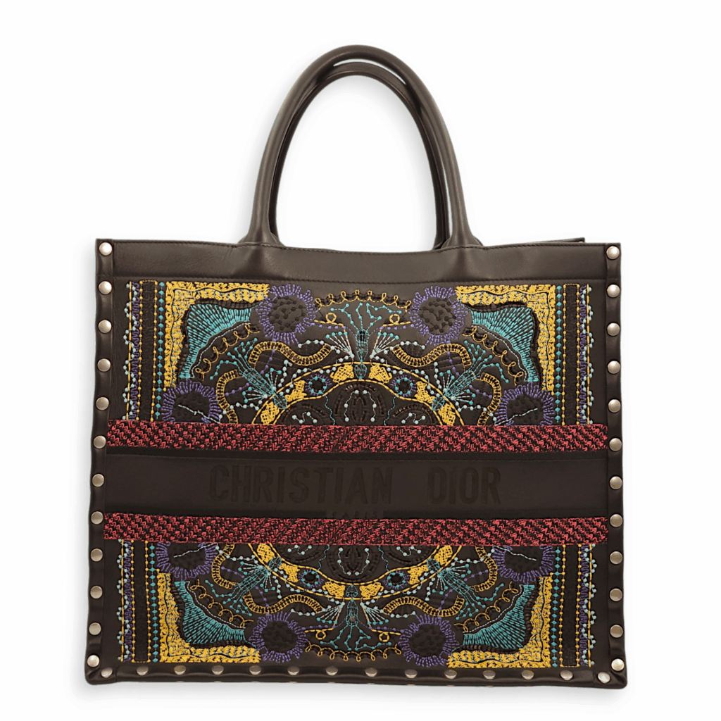 Book Embroidered Studded Leather Large Multicolor Tote Bag in Calfskin, Palladium hardware