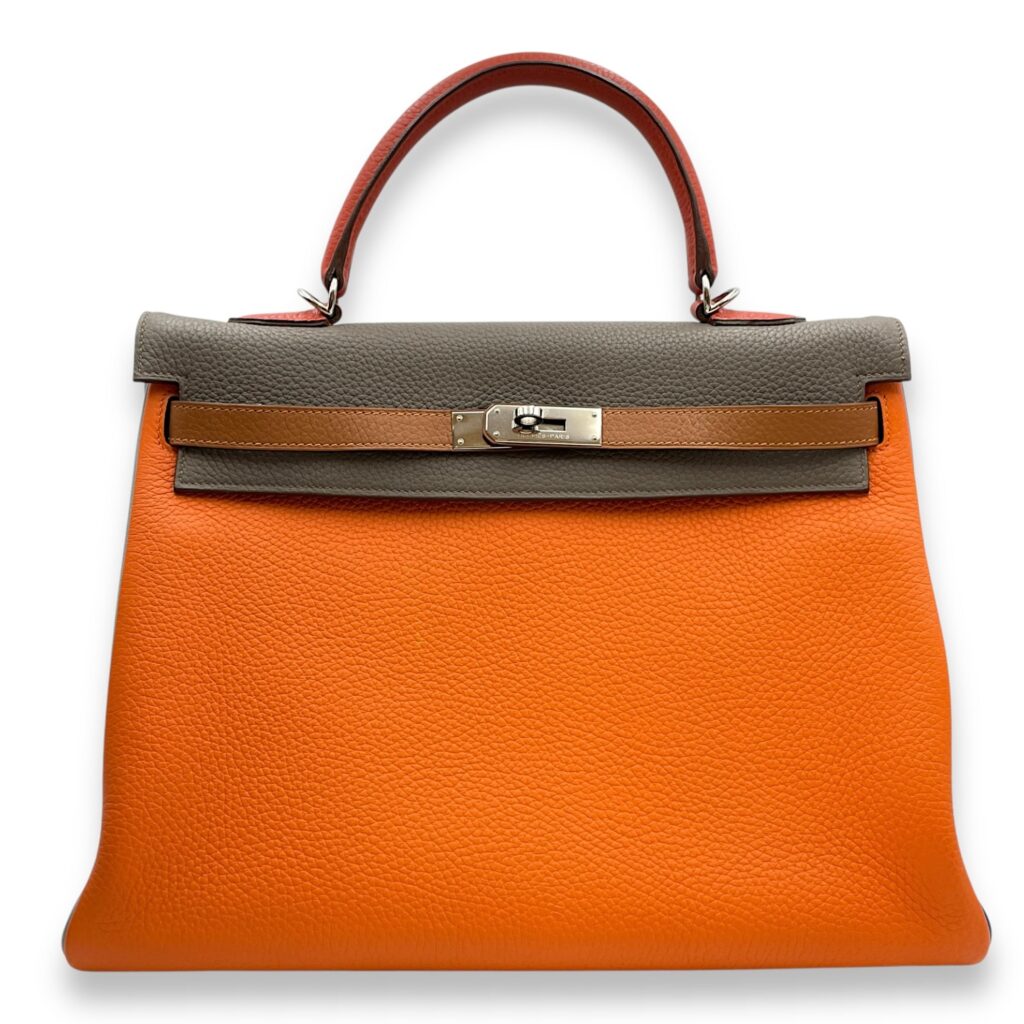 Kelly Arlequin 35 Orange/Etain/Gold/Blue in Clemence, Palladium hardware